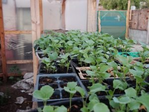 We’re transplanting our seedlings from the greenhouse, now that we’ve tilled and prepared the soil. We are growing zucchini and few different types of squash, along with cabbage, peas, corn, beets, peppers, and tomatoes.
