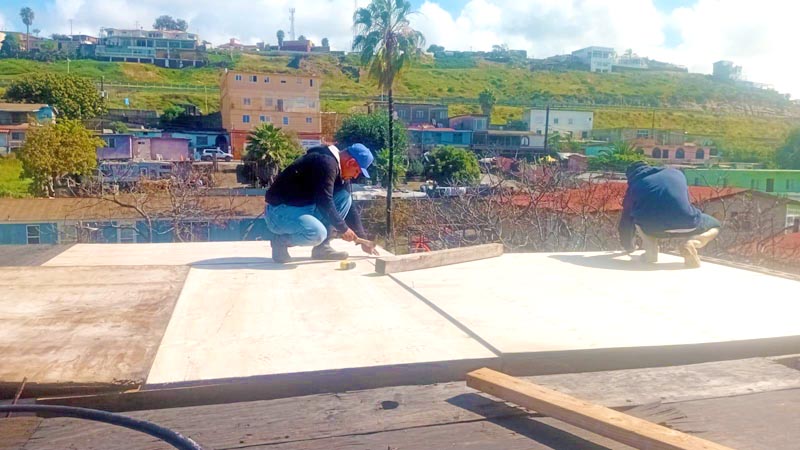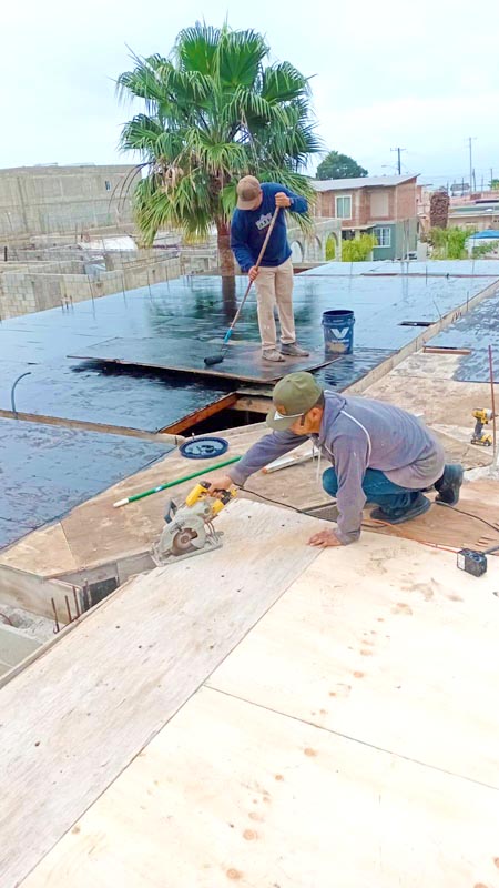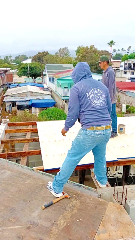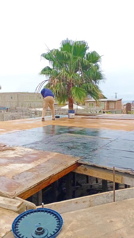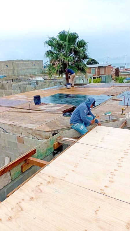 We’ve had so much rain since our last update! This puts all the wood we have up for the concrete roof form at risk. So we grabbed a drum of cold tar to coat the wood. After this, we build the rebar support structures that give the concrete stability, and we’ll be only a few weeks away from having this roof ready to pour! (You can see more about the beginning of this project here)