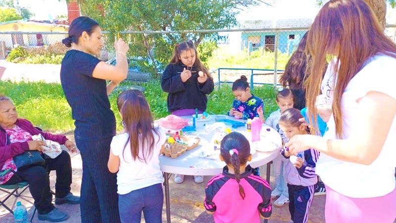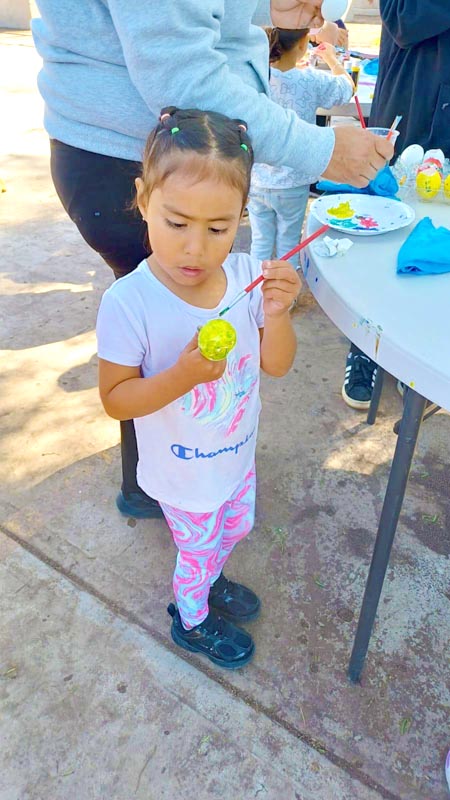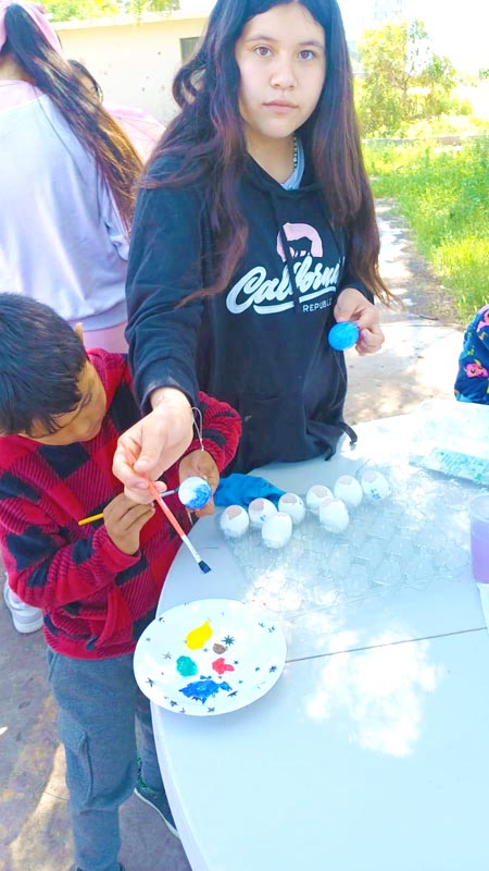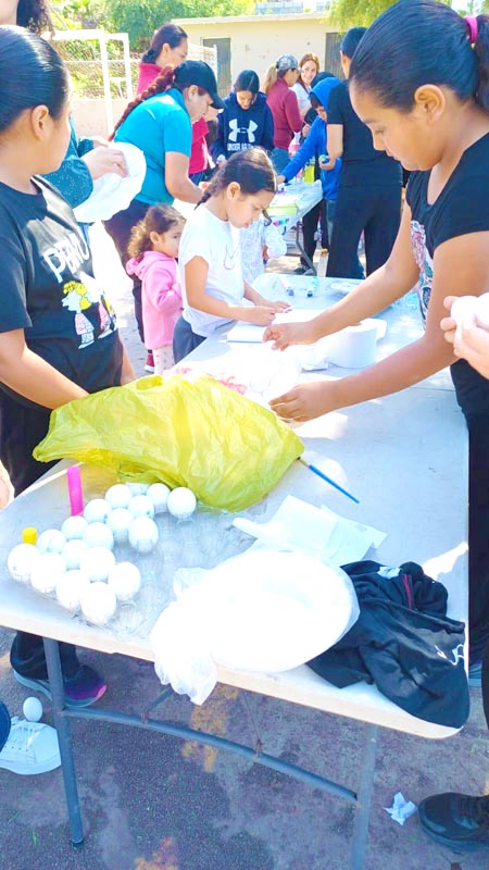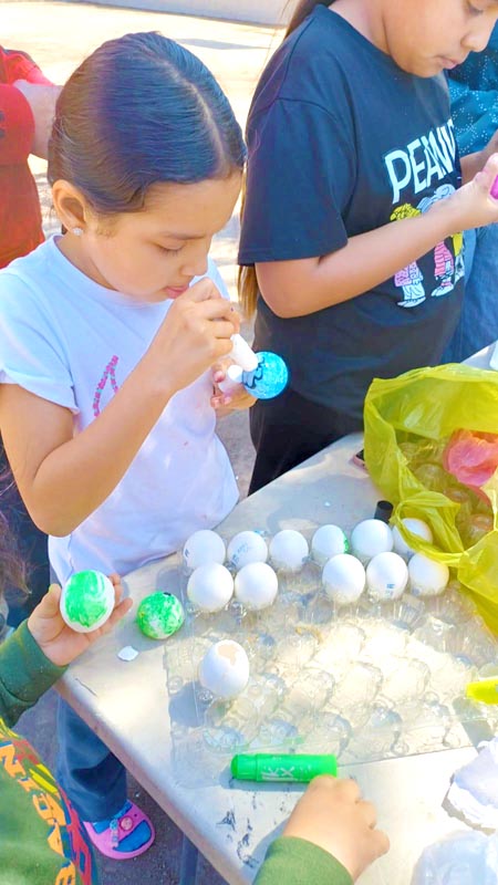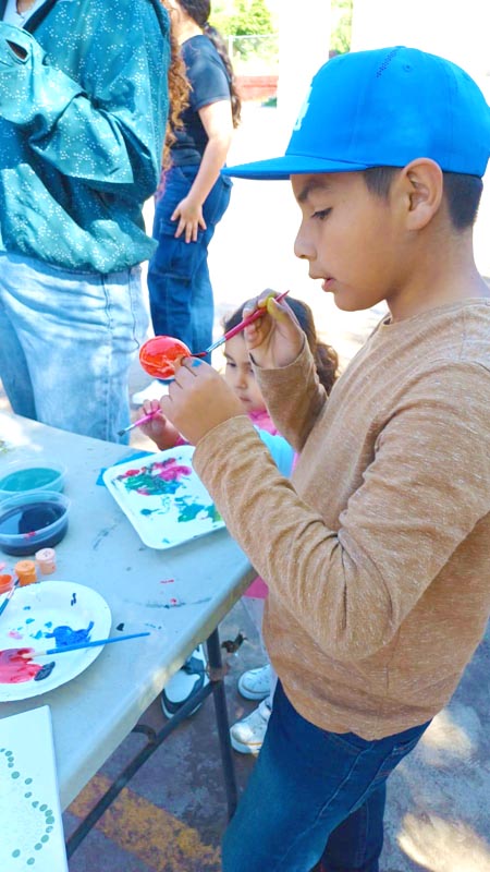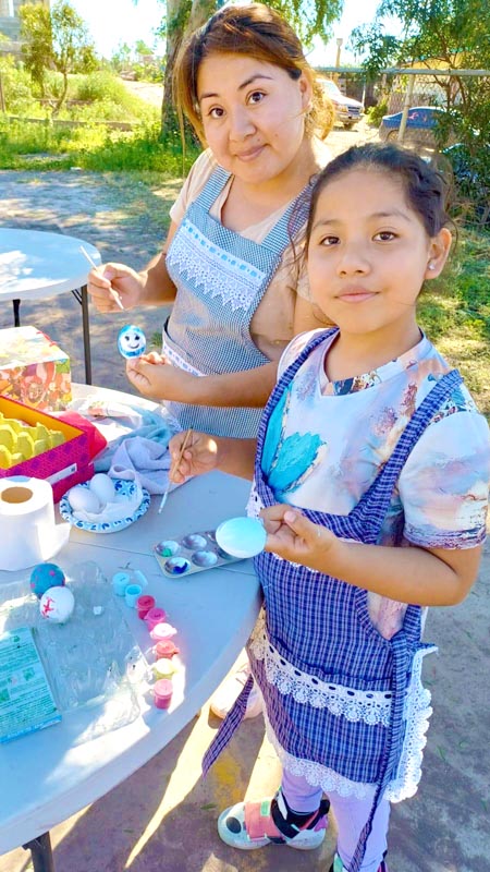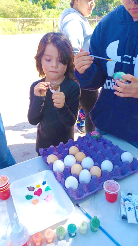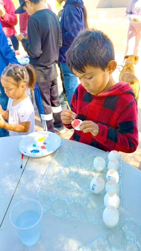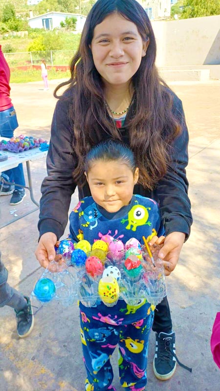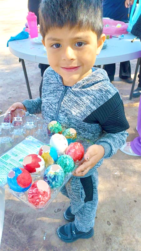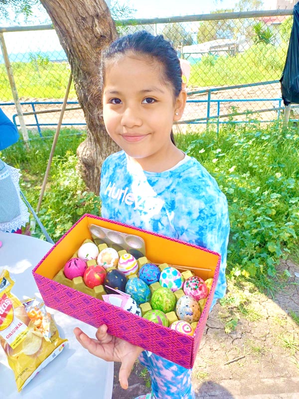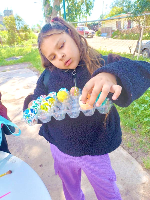 Here, we don’t decorate hard-boiled eggs, we make cascarones! The kids decorate empty eggshells that have been washed and dried. And then after decorating, they’re filled with confetti and closed with a little square of tissue paper and glue. Then we hide them, and after you find one, you smash it over a friend’s head, and confetti covers everyone, there’s no way to escape it. Just like God’s love!